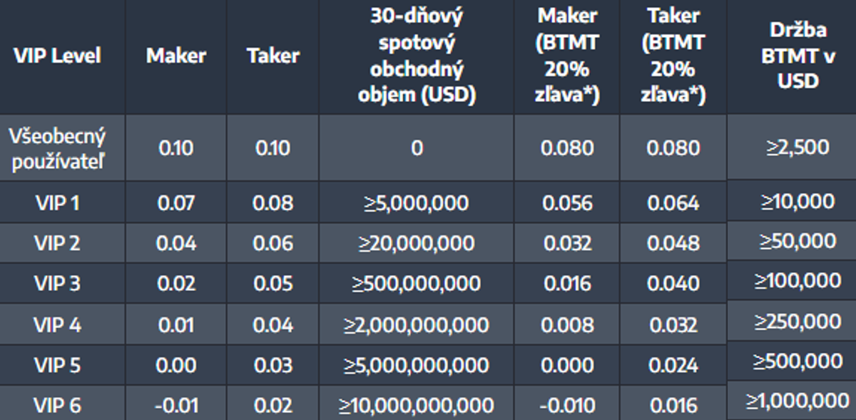 Ako vidíte v tabuľke nižšie, BITmarkets poskytuje zľavy z poplatkov za obchodovanie. To znamená, že všetci aktívni používatelia sú odmeňovaní za svoju podporu. VIP klienti môžu získať zľavy automaticky, ak splnia niektorú z nižšie uvedených podmienok úrovní a budú mať nárok na príslušné obchodné poplatky.