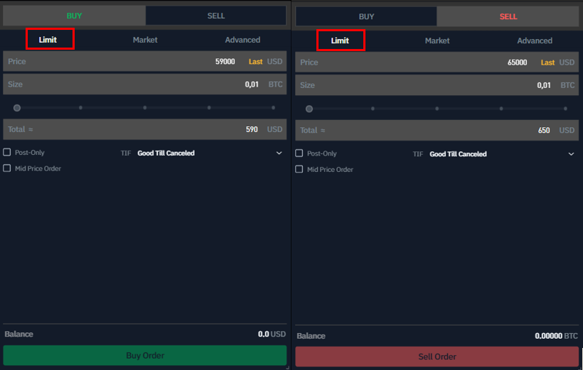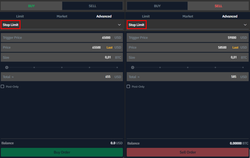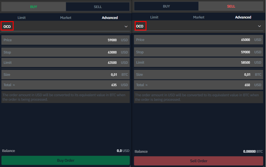 Pri predaji, keď Bitcoin dosiahne 65 000 USD, limitný príkaz bude splnený. To znamená, že príkaz stop limit bude automaticky zrušený. Naopak, keď Bitcoin dosiahne 59 000 USD, spustí sa príkaz stop limit s cenou 58 500 USD a limitný príkaz sa automaticky zruší. V oboch prípadoch obchodujeme množstvo 0,01 BTC.