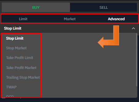 Všetky vyššie spomenuté obchodné príkazy môžete nájsť v sekcii zadávania obchodných príkazov. Máte možnosť zvoliť základnú objednávku Limit, Market alebo pod Advanced nájdete ostatné typy.