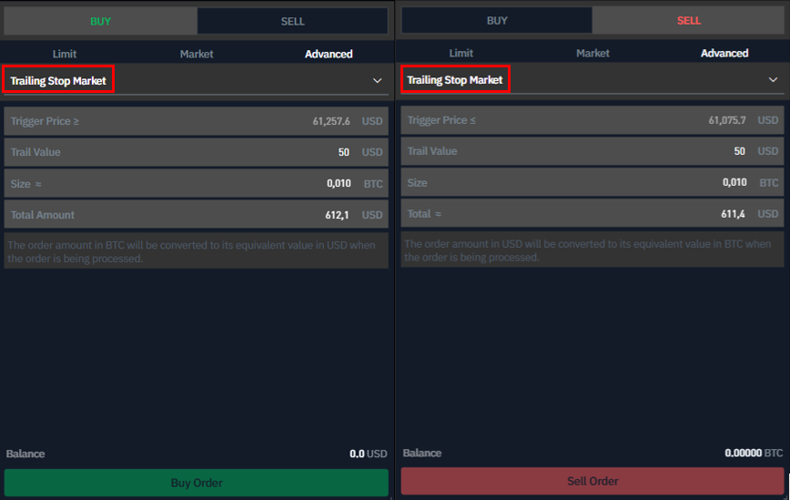 - Trigger price: spúšťacia cena, pri ktorej sa otvorí objednávka. Mení sa podľa toho akú hodnotu zvolíte pri Trail value.