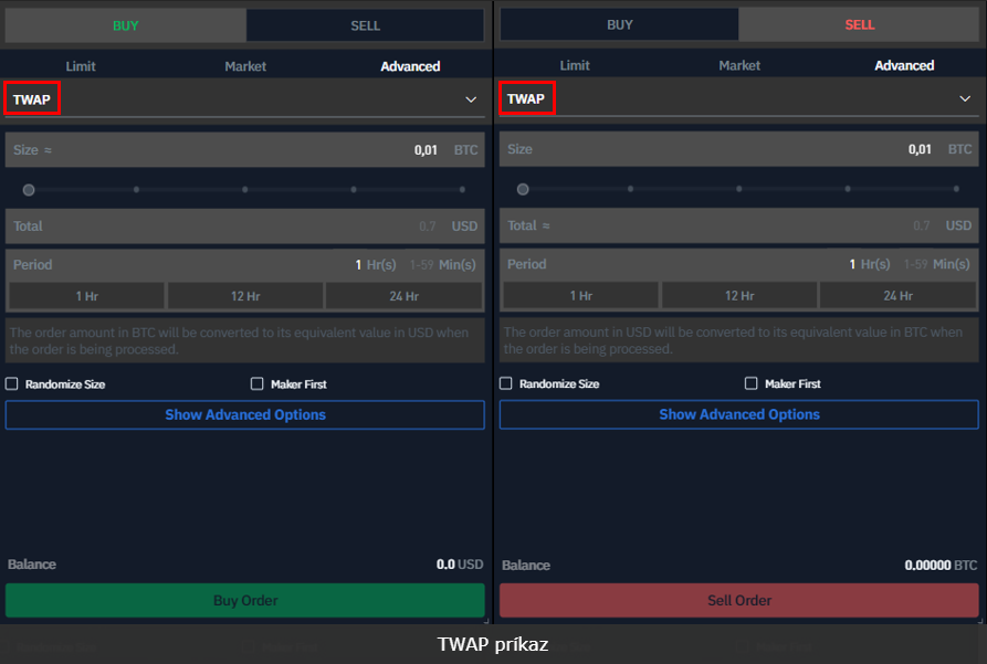 TWAP rozdeľuje jedno objednávku na viacero. Vďaka tomu sa vyhnete problémom s likviditou alebo viete schovať veľké objednávky. Na BITmarkets tento príkaz umožňuje nastavenie časového rozsahu na 1,12 a 24 hodín. Počas tejto vami zadanej doby bude algoritmus zadávať objednávky v pravidelných intervaloch. V našom príklade sme zvolili množstvo 0,01 BTC.