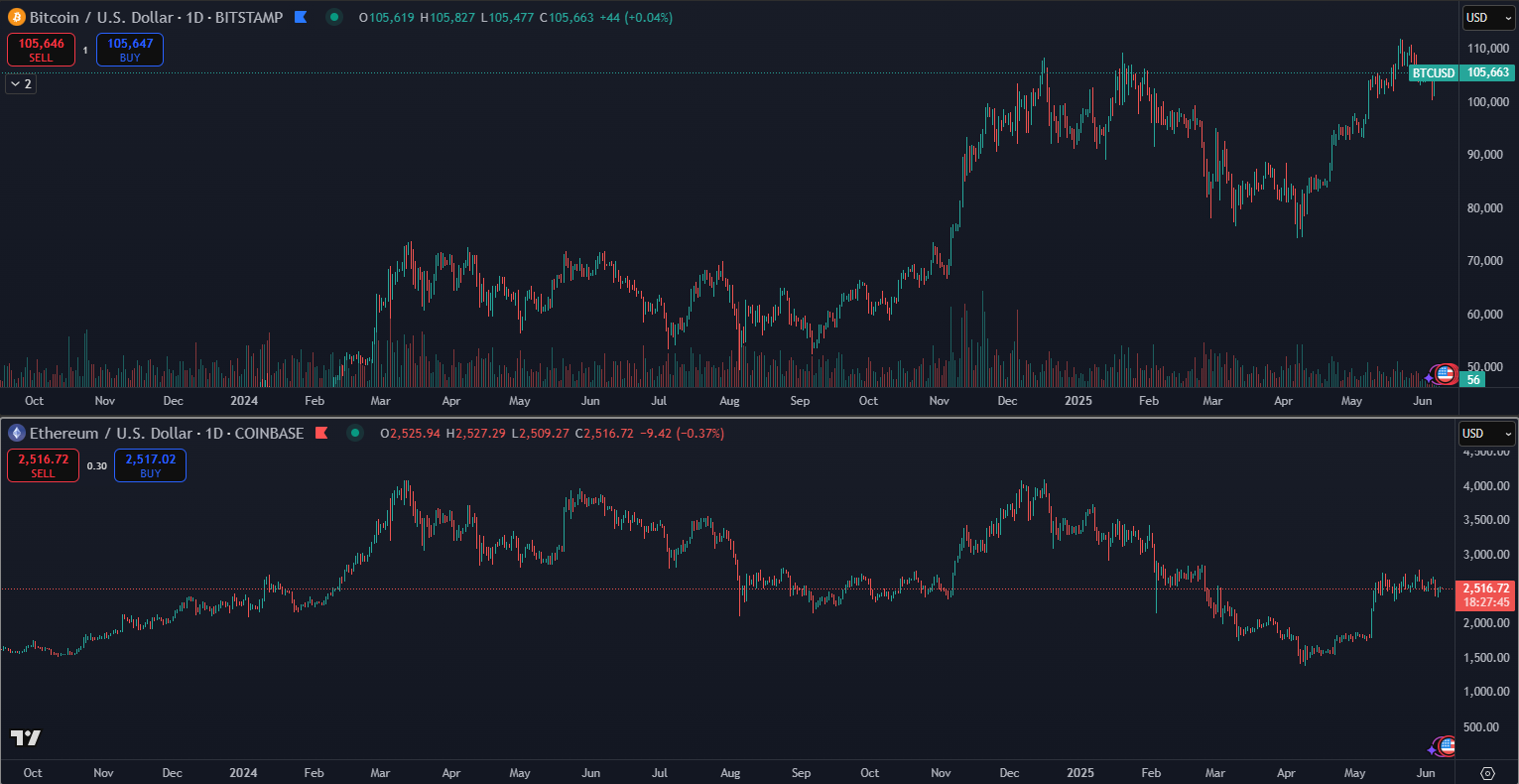 Kryptomeny BTC a ETH. Zdroj: tradingview.com