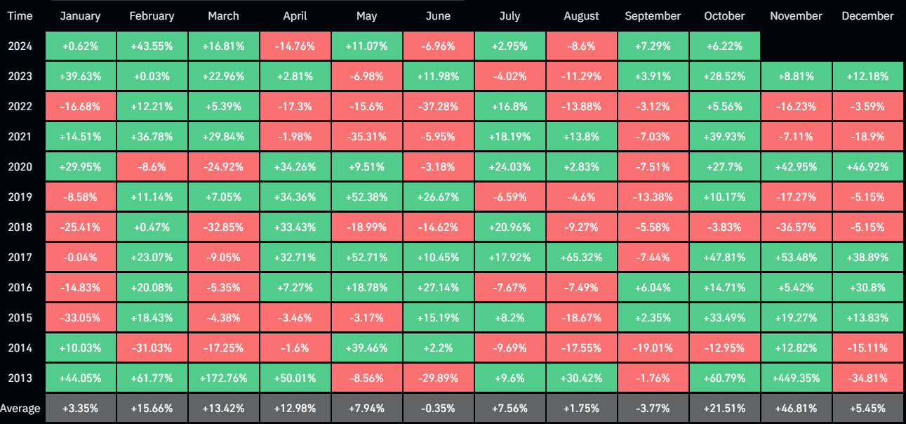 Bitcoin v súčasnosti vstupuje do najziskovejšieho obdobia z celého roka na základe údajov o mesačnej ziskovosti z poslednej dekády. November je pre Bitcoin podľa údajov Coinglass najziskovejším mesiacom z roka s priemernou hodnotou +46,81 %.