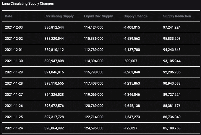 Ak sa pozrieme na spaľovací proces ETH, ktorý začal v auguste, doteraz sa spálilo viac ako 1,1 milióna ETH. Táto hodnota však predstavuje iba 1 % z celkovej ponuky 117,8 miliónov. V prípade tokenu LUNA bolo za posledných 10 dní zaznamenaný pokles celkovej ponuky o viac ako 1,4 %. Masívny spaľovací proces je teda s veľkou pravdepodobnosťou zodpovedný za pozitívny cenový rast.