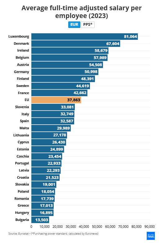 Priemerné ročné mzdy v krajinách EÚ. Zdroj: Eurostat