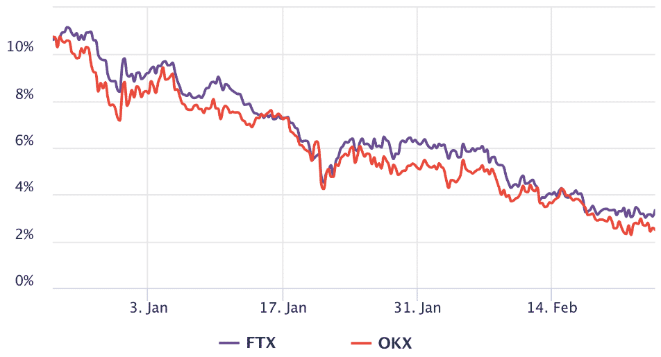 Úrovne pod 5 % sú extrémne medvedie, zatiaľ čo ročná prémia nad 12 % naznačuje býčí trend. Ako je uvedené vyššie, futures prémia klesla 9. februára pod 5 %, čo svedčí o nedostatku dôvery zo strany profesionálnych obchodníkov.