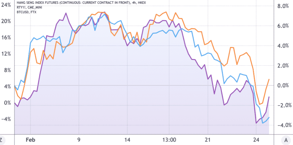 Existuje vysoká korelácia medzi Bitcoinom, akciovým trhom Hang Seng a americkým indexom Russell 2000. Možným vysvetlením sú sprísňujúce ciele Federálneho rezervného systému USA. Znížením spätných odkupov dlhopisov a hrozbou zvýšenia úrokových sadzieb menová autorita spôsobila podobný pohyb.