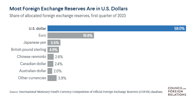 Napriek rastúcej snahe krajín BRICS a ASEAN o dedolarizáciu, americký dolár si naďalej udržiava dominantné postavenie v globálnych devízových rezervách. Podľa správy Council on Foreign Relations tvorili americké doláre až 59 % všetkých svetových rezerv cudzích mien v prvom štvrťroku 2023.