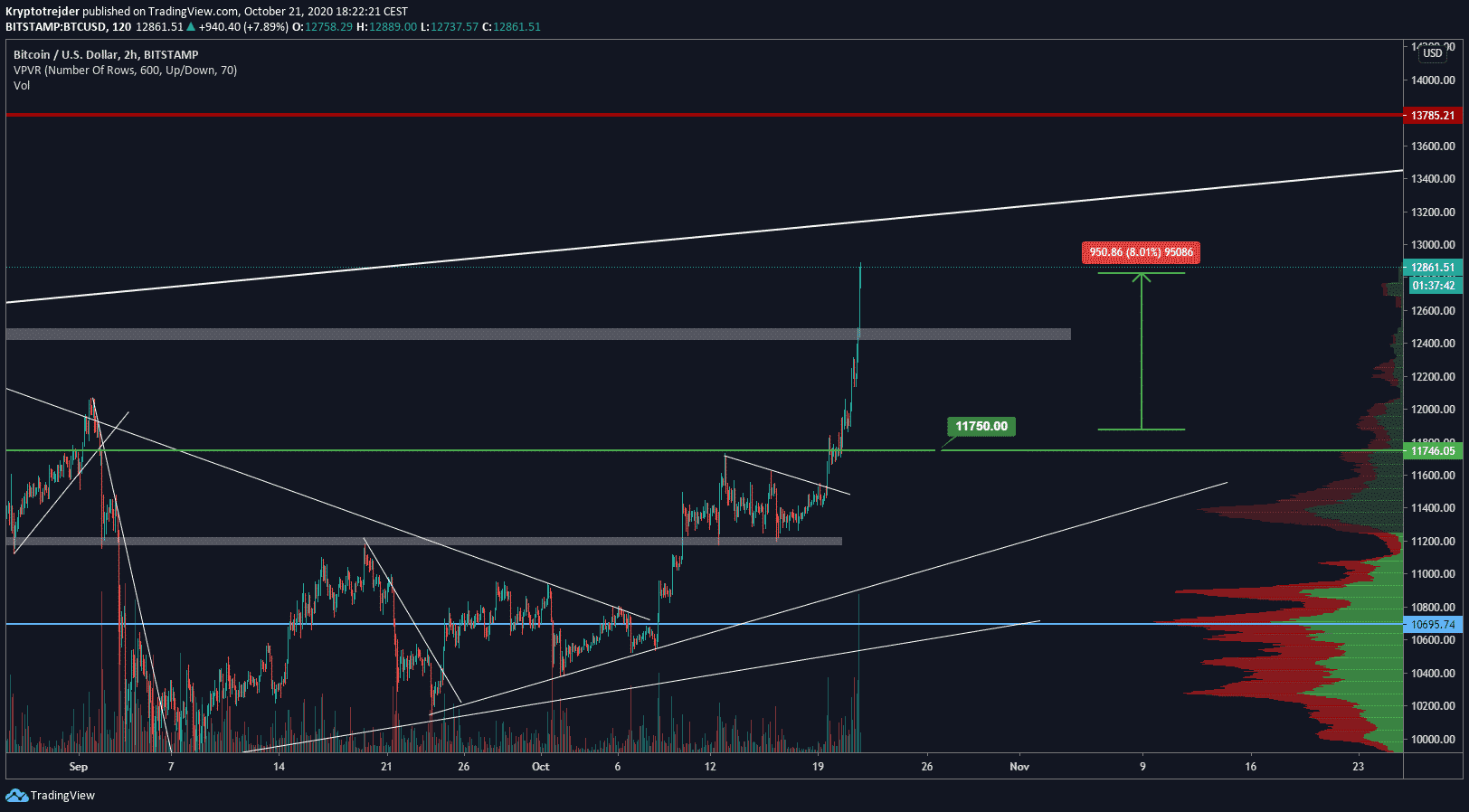 Dá sa povedať, že PayPal napumpoval poriadne cenu BTC smerom nahor. Posledné dlhodobé maximum sa nachádzalo na hodnote 12,500$. Cene sa podarilo preraziť túto hodnotu a tak BTC oficiálne ukončilo konsolidáciu od ATH.