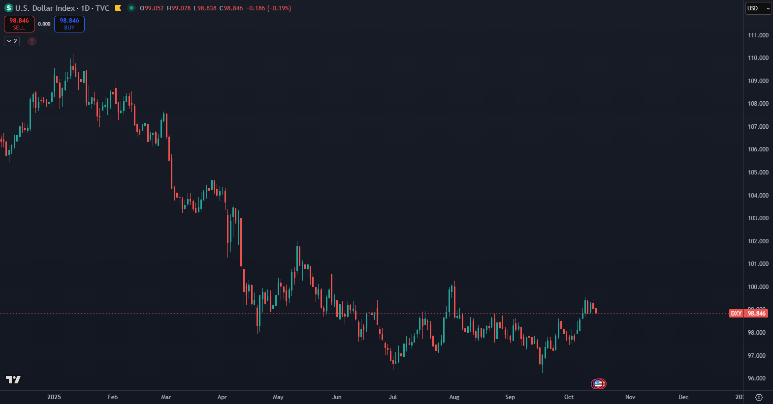 Podľa jeho výpočtov dochádza k približne 11 % ročnému znehodnocovaniu meny oproti 2 % rastu HDP. Znehodnotenie meny je najlepšie viditeľné na dolárovom indexe DXY, ktorý podľa údajov TradingView klesol v roku 2025 o 9 %. Tento pokles jasne ukazuje, že americký dolár stráca svoju kúpnu silu, čo priamo ovplyvňuje rast cien aktív a zvyšovanie P/E pomerov na finančných trhoch.
