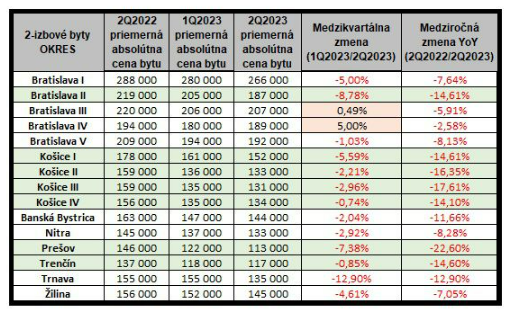 Najviac klesli ceny v Prešove. Dvojizbové byty zaznamenali pád cien až o 22,6 % medziročne. Výrazný pokles nastal aj v Košickom kraji od 14 % do 18 %, zatiaľ čo v Bratislave bol pokles od 3 % do 15 %. Okrem centra, kde niektoré väčšie byty zdraželi až o 14 %.