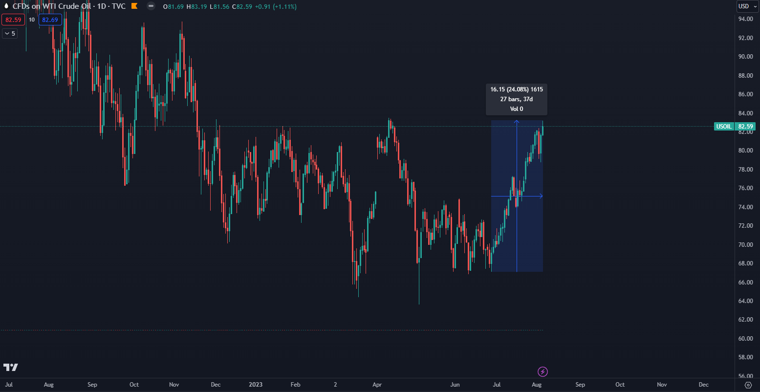 Na grafe nižšie môžeme vidieť cenový rast ropy WTI. Od konca júna cena narástla počas 6 týždňov až o 24 %, čo je zároveň najvyššia cena od 12. apríla 2023. Pokračovanie tohto trendu zabezpečí, že cena prekoná najvyššiu úroveň od novembra 2022. Ide zároveň o porovnateľný vzostup, aký sme videli na prelome marca a apríla. Vtedy cena dokonca vytvorila medzeru a preskočila niekoľko dolárov.