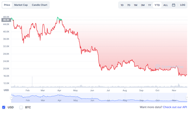V súčasnosti pokles Bitcoinu predstavuje zhruba 75 % zo svojho historického maxima v roku 2021. Jeho kapitalizácia predstavuje približne 318 miliárd $, pričom v roku 2021 sa bežne pohybovala nad úrovňou 1 bilióna $. Ďalší vývoj ceny bude závisieť od makroekonomickej situácie či legislatívnej regulácie, a preto vysoká volatilita môže pokračovať aj v roku 2023.