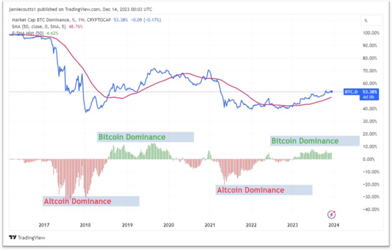 Coutts vo svojom príspevku na sociálnej sieti X (Twitter) uviedol, že Bitcoin stále dominuje na trhu v oblasti trhovej kapitalizácie. Tvrdí, že tento rastúci trend dominancie môže trvať dlhšie ako predošlé cykly, ak budú schválené spotové ETF pre Bitcoin. Prúdil by do nich totiž obrovský kapitál, čo by opäť zvyšovalo dominanciu najväčšej kryptomeny na svete.