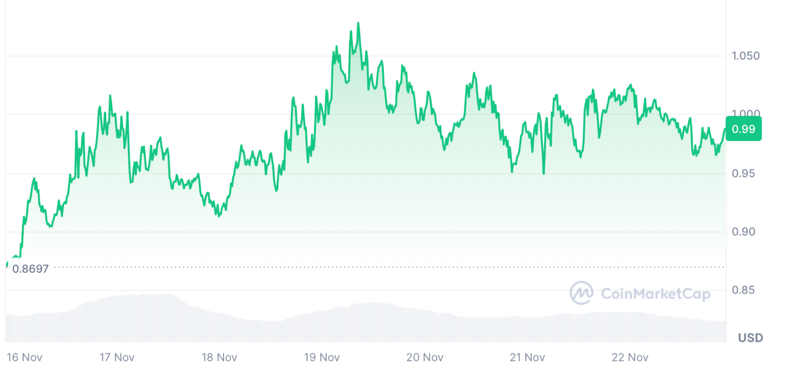 Technické ukazovatele ukazujú zaujímavé vzory. Index relatívnej sily je na úrovni 53,58, čo naznačuje, že trh nie je ani prekúpený ani prepredaný. Oba 10-dňové a 100-dňové jednoduché kĺzavé priemery sú na úrovni 0,99 dolárov, čo naznačuje stabilné oceňovanie počas týchto období. Najbližšie úrovne odporu sú na 1,14 a 1,37 dolároch. Úrovne podpory sú na 0,68 a 0,46 dolároch.