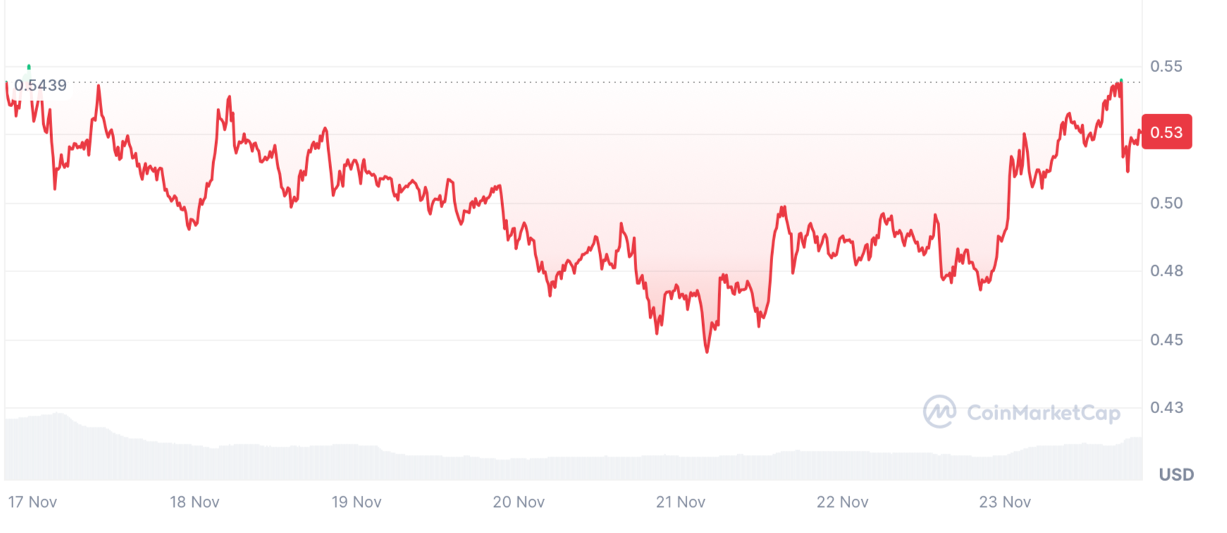 Sei sa obchoduje medzi 0,43 a 0,56 dolármi, s najbližším odporom na úrovni 0,62 dolárov. Prekonanie tejto úrovne by mohlo viesť k ďalšiemu odporu na 0,76 dolároch, čo predstavuje nárast približne o 35 %. Ak cena klesne, podpora leží na úrovni 0,36 dolárov, čo znamená pokles približne o 20 %. Nedávne zisky mince naznačujú, že by mohla čoskoro testovať vyššie úrovne odporu.