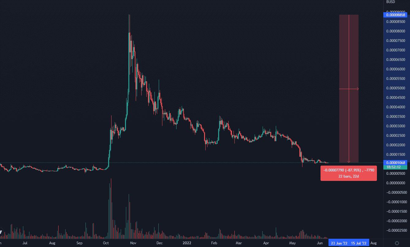 Aj napriek týmto zaujímavým krokom, projekt Shiba Inu nedokáže ustáť aktuálny medvedí trh. V čase písania tohto článku sa meme coin SHIB obchodoval na úrovni 0,00001068 USD. Od 27. októbra 2021 prakticky neustále klesá, pričom do dnešného dňa stratil takmer 88 %.