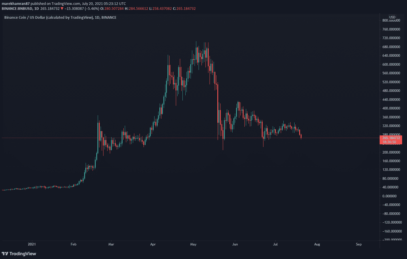 V čase písania tohto článku sa BNB pohyboval na úrovni 265,184 USD. Po májovej korekcii sa stále pohybuje až 56% pod svojím historickým maximom z 10.mája na úrovni 686 USD. Od začiatku roka 2021 však zaznamenal rast až o 700%, čo je pôsobivý výsledok.