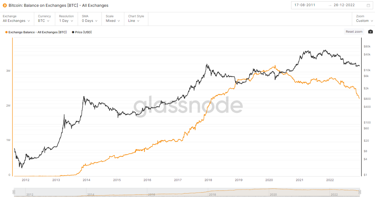 Metrika čistého prílivu, resp. odlivu bitcoinov z búrz už viac ako 2 a pol roka ukazuje jednoznačný trend. Na grafe nižšie môžeme vidieť, ako to ovplyvnilo zostatky na burzách. Nedávny krach kryptomenovej burzy FTX zapríčinil mesačný čistý odliv vyše 200 000 BTC, čo je historický rekord a trend navyše naberá stále na sile.
