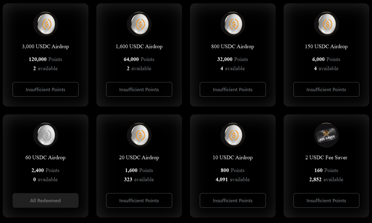 - Airdrop v hodnote 3 000 USDC, ktorý si možno uplatniť za 120 000 bodov.
