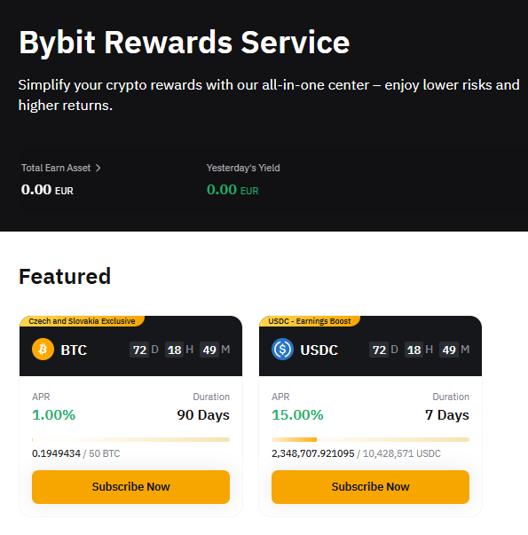 • Bybit EU Rewards Service ponúka fixné obdobia investícií so stabilnými výnosmi.
