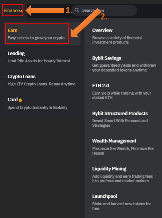 Ďalšou významnou možnosťou, ako zhodnocovať svoj kapitál, je systém Earn Bybit, do ktorého sa dostanete z domovskej stránky cez políčko Finance.