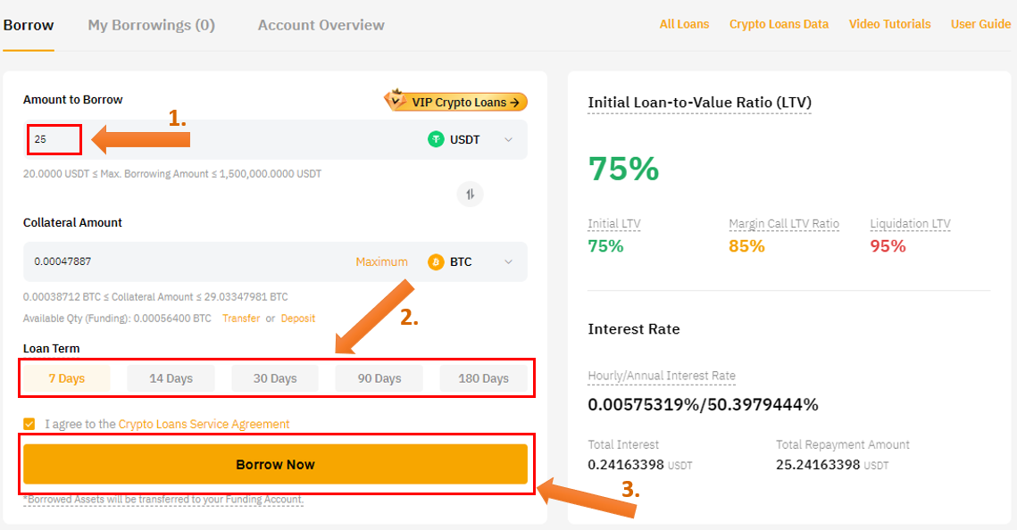 Kryptomenové pôžičky Crypto Loans slúžia na to, že si požičiate jeden typ kryptomenového aktíva s použitím iného ako kolaterálu. Požičané aktíva možno obchodovať na spotových a derivátových trhoch Bybit, použiť ich v programe Earn alebo ich stiahnuť. Úrok sa počíta za hodinu, pričom pôžičky, ktoré sú kratšie ako jedna hodina, sa počítajú ako jedna hodina. Úroky sa začnú pripisovať v čase pôžičky. Úrok sa počíta na základe úrokovej sadzby úveru zobrazenej v čase pôžičky.