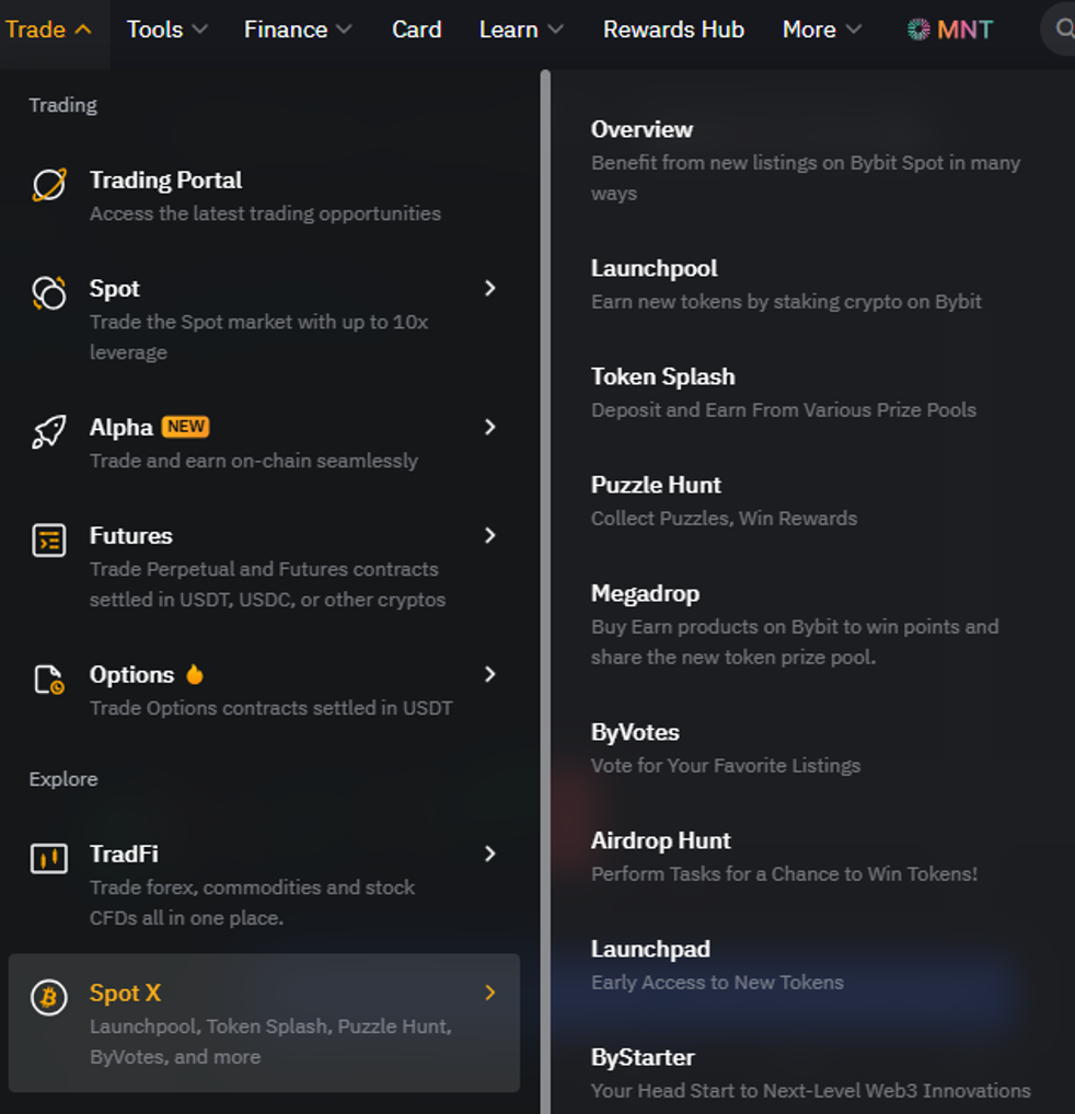 Spot X je komplexná sekcia na platforme Bybit, ktorá zahŕňa širokú škálu možností na získavanie nových tokenov a odmien. Prostredníctvom produktov môžu používatelia aktívne participovať na inovatívnych kampaniach. Spot X spája gamifikáciu, komunitné hlasovanie a investičné príležitosti do jedného ekosystému.