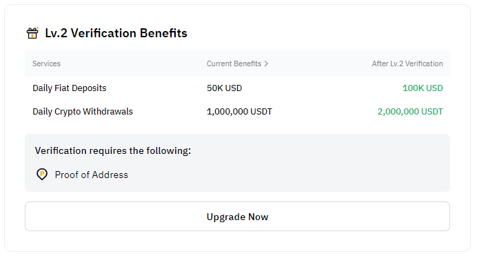 Pre bežného používateľa je 1. úroveň KYC dostačujúca. Ak by ste ale mali záujem o 2. úroveň, je potrebné nahrať aj doklad, ktorý overuje vašu adresu. Ide napríklad o bankový výpis, účet za telefón, TV alebo internet a podobne. Zároveň by sa vám navýšil denný vklad fiat meny z 50 000 dolárov na 100 000 dolárov a denný výber kryptomien z 1 milióna USDT na 2 milióny USDT. Dokonca v prípade biznis KYC môžete denne vyberať až 4 milióny USDT, no táto úroveň je určená pre firmy.