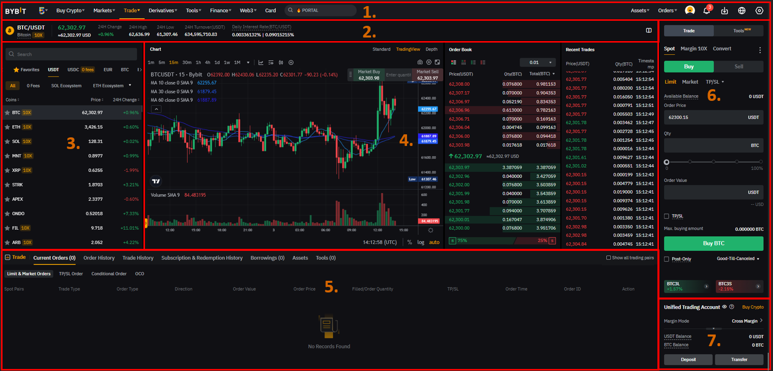 Po tom, čo sme úspešne vložili finančné prostriedky do peňaženky, môžeme si vysvetliť, ako vyzerá obchodné rozhranie burzy Bybit. Logiku si ukážeme na spotovom trhu, aj keď obchodovať na burze viete aj na derivátovom trhu.