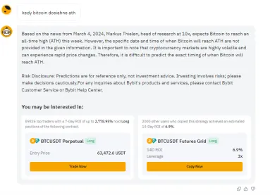 Keď už sme pri umelej inteligencii, Bybit ju neimplementuje iba do obchodovania cez bota. Viete využiť aj možnosť TradeGPT, taktiež v sekcii Tools, kde si viete písať s umelou inteligenciou ohľadne kryptomien a všeobecne o obchodovaní. My sme sa spýtali, kedy Bitcoin dosiahne ATH (all time high – najvyššia historická cena). Zaujímavé je, že reagoval aj na slovenskú otázku. Odporúčame využiť túto možnosť.