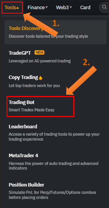 Na burze Bybit existuje nespočetné množstvo obchodných nástrojov. Jeden z nich je robot na obchodovanie. Stačí sa na domovskej stránke prekliknúť cez Tools a Trading Bot. Ide o komplexnú platformu pre automatizované obchodovanie s kryptomenami. Táto stratégia šetrí čas a dodatočné náklady, no na druhej strane odovzdávate peniaze robotovi a nemáte ich pod kontrolou.