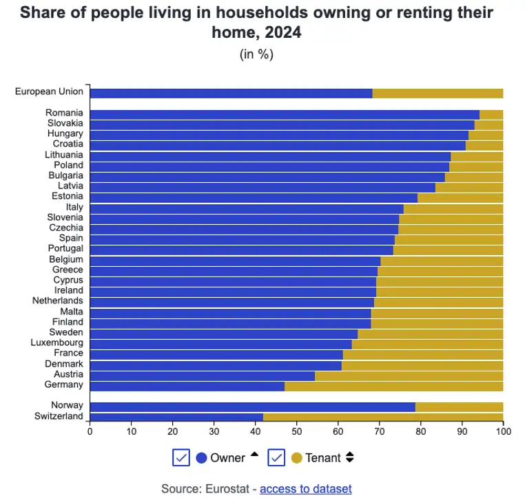 Podiel ľudí žijúcich v domácnosti, ktorú vlastnia alebo v nájme. Zdroj: ec.europa.eu/eurostat