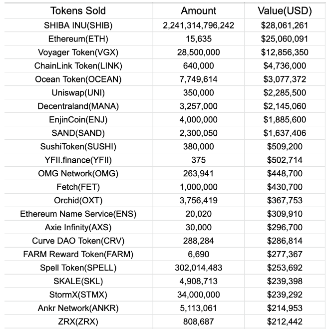 Lookonchain odhalil, že Voyager použil 23 tokenov v hodnote viac ako 100 miliónov dolárov. Najviac bolo predaných mincí Shiba Inu a to celokovo v hodnote 28 miliónov dolárov. Nasleduje ethereum s 25 miliónmi dolárov.