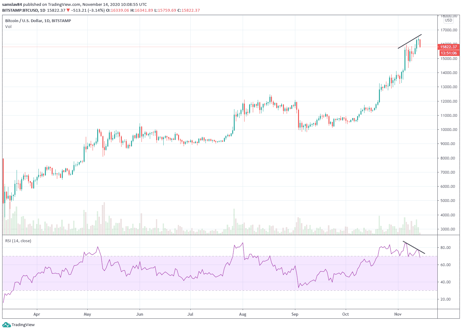 Samozrejme, pokles zatiaľ nie je nijak agresívny, no 400 $ za tri hodiny už rozhodne stojí za zmienku. Bitcoin už dnes stratil takmer tri percentá, čo v tak volatilnom období nie je nič hrozné, no ak si uvedomíme, že takmer všetky populárne indikátory kričia SELL, je ťažké veriť v pokračovanie tohto bullrunu.
