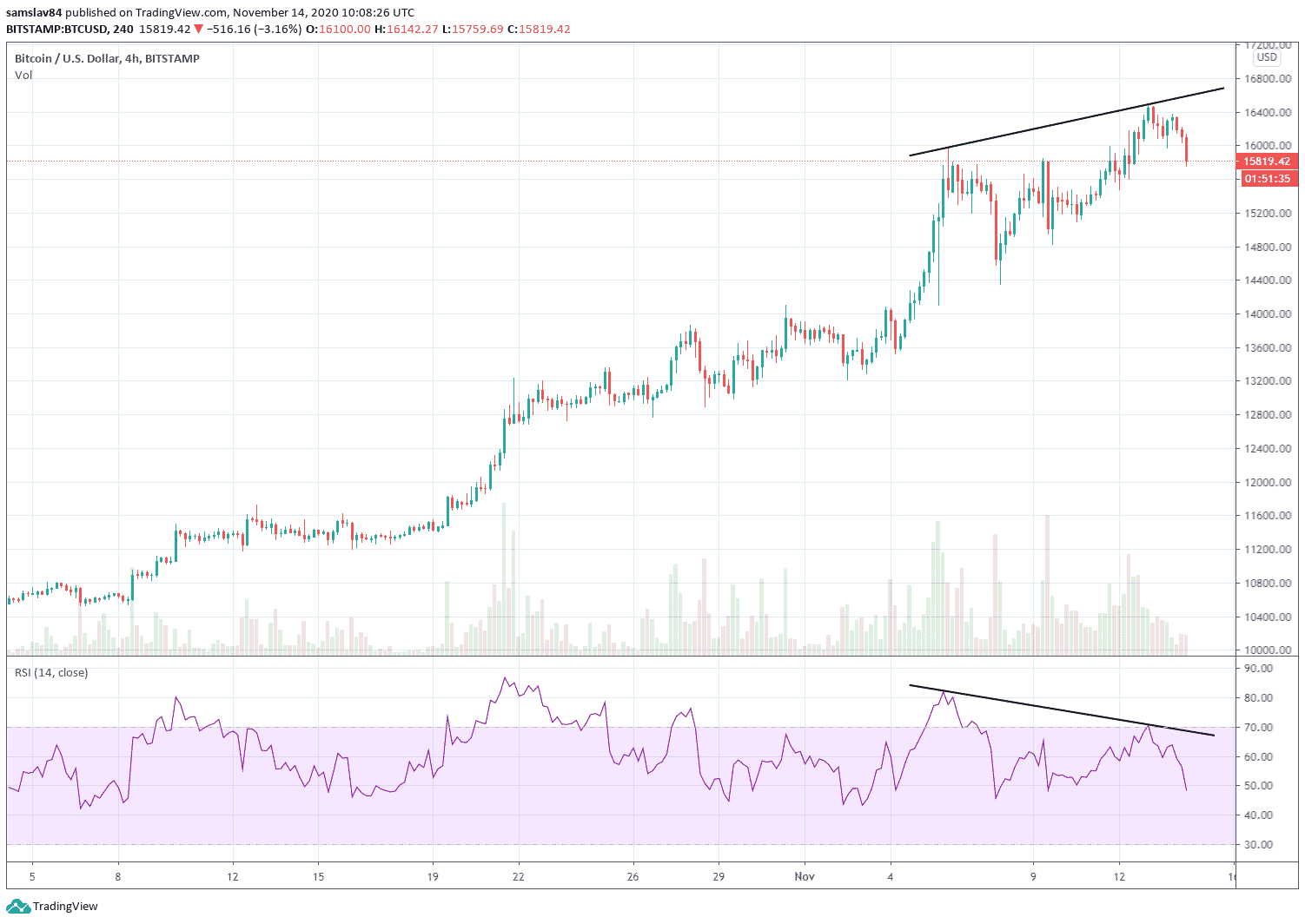 Bitcoin sa pohybom nad 16 000 $ dostal do extrémne prekúpenej zóny. TradingView indikátor ukazuje strong buy, Fear & Greed indikátor varuje pred chamtivosťou na trhu, na grafe sa takmer na všetkých timeframoch vytvorili RSI a MACD rezistencie, volume na burzách postupne klesá…
