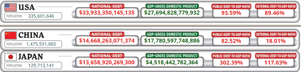 USA dosahuje rekordný dlh 33,9 bilióna dolárov, Čína 14,6 bilióna dolárov a Japonsko 13,6 bilióna dolárov. V pomere k hrubému domácemu produktu (HDP) je na tom jednoznačne najhoršie Japonsko. Verejný dlh je totiž 3-krát vyšší ako HDP krajiny.