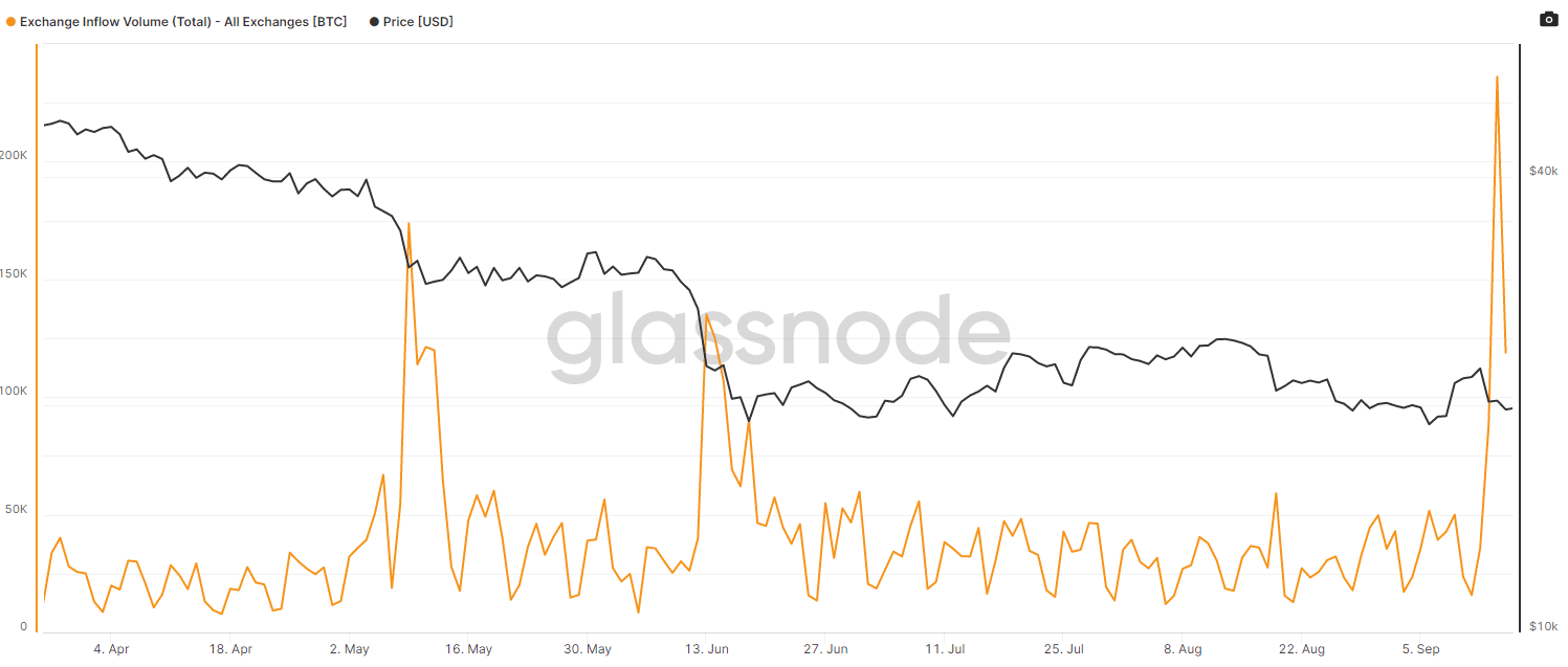 Na grafe nižšie môžeme vidieť vysoký príliv na spotových burzách, ktorý bol zaznamenaný 14. septembra. Počet mincí, ktoré boli presunuté na burzy, dosiahol hodnotu až 236 105,75 BTC za 24 hodín. Väčšiu hodnotu metrika dosiahla naposledy 13. marca 2020, keď príliv prekonal 309 000 mincí za jediný deň.