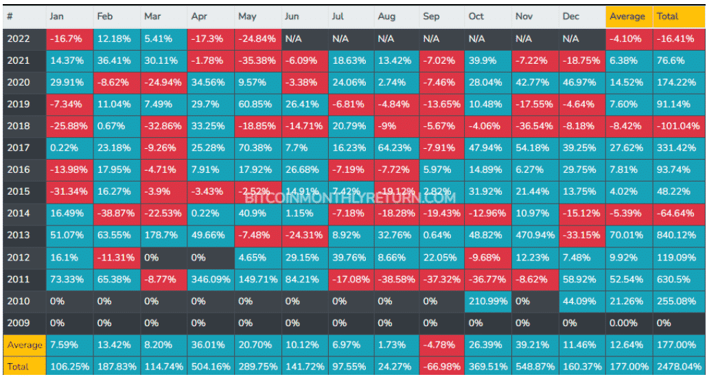 Priemerný mesačný výnos Bitcoinu od začiatku mája do konca septembra od roku 2011 je 6,95 %. Priemerný mesačný výnos v ostatných siedmich mesiacoch roka je 20,33 %. V medvedích rokoch, ako je rok 2018, sa BTC v týchto mesiacoch obchodoval predovšetkým na červeno.