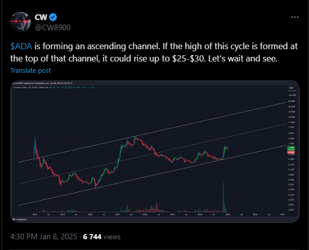 Cardano (ADA) je blockchain, ktorý získava na popularite. Za posledných 24 hodín cena ADA vzrástla o 4,36 %, čím sa dostala na 0,96 dolára. Jeho trhová kapitalizácia dosiahla 33,8 miliardy dolárov, čo ukazuje rastúci záujem. Nedávny tweet hovorí, že ADA vytvára vzostupný kanál, a ak sa vzor udrží, cena by mohla vystúpiť na 25 alebo 30 dolárov. To znamená nárast o 2 500 % až 3 000 % oproti dnešným cenovým úrovniam.