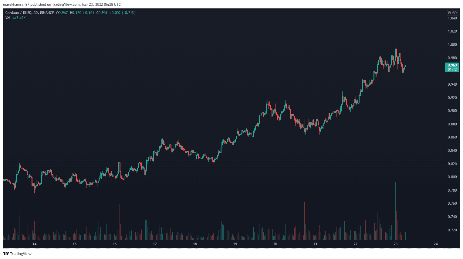 V čase písania tohto článku sa natívny token blockchainu Cardano ADA obchodoval na úrovni 0,969 USD. Za posledných 7 dní ide o nárast až o 20,7 %.