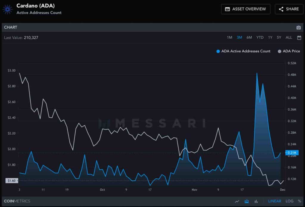 Podľa grafu vyššie je však zrejmé, že zatiaľ čo cena digitálneho tokenu ADA klesala, počet aktívnych adries súčasne stúpal. To znamená, že napriek pomalému nárastu cien kryptomena naďalej získava záujem.