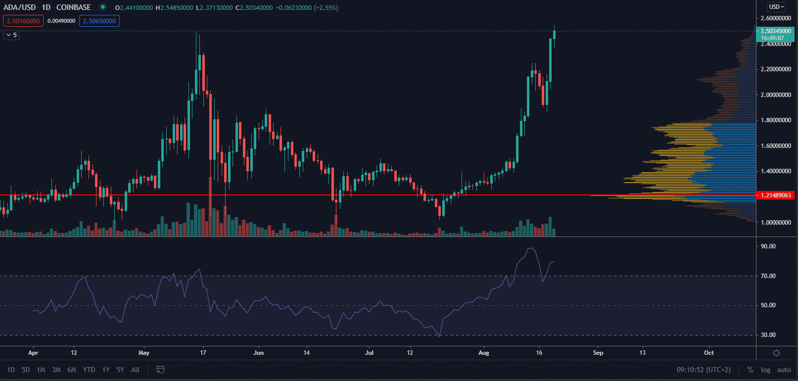 Cena ADA sa v priebehu dňa zvýšila o ohromujúcich 17 % a pokračuje vo svojom úsilí dosiahnuť vyššie ATH. Cardano sa v čase písania článku obchoduje za 2,50 $ po tom, čo dosiahlo rekordné maximum 2,55 $.