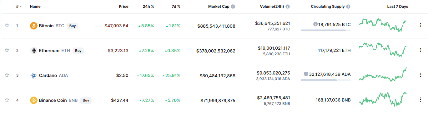 Podľa údajov Coinmarketcap je v súčasnom čase trhová kapitalizácia ADA 80,4 miliardy dolárov v porovnaní s 71,9 miliardami BNB.