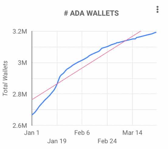 Za prvý štvrťrok pribudlo 453 121 peňaženiek. Ešte začiatkom roka bol celkový počet peňaženiek hodlujúcich natívny token ADA na úrovni 2 666 372. Do 31. marca tento stav narástol až na 3 193 445. Denne teda Cardano získalo viac ako 5 000 peňaženiek.