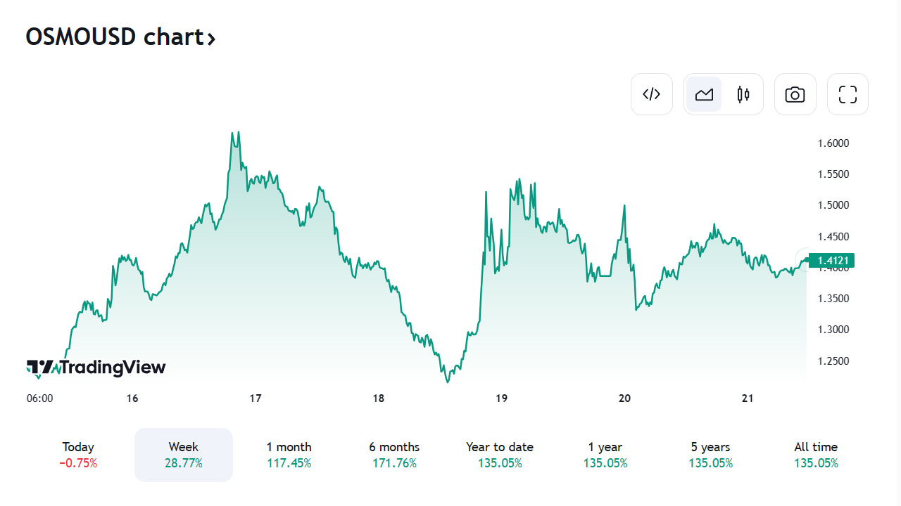 Osmosis nedávno vykázal pozoruhodnú výkonnosť v sektore DeFi, pričom jeho token za posledný mesiac získal viac ako 100 %. Nárast ceny tokenu je významný, najmä vzhľadom na stagnáciu širšieho trhu. Token sa obchodoval za približne 1,3 dolára, čo odráža rastúci záujem a dôveru v DeFi schopnosti. Protokol v priebehu roka 2022 a začiatkom roka 2023 implementoval podstatné aktualizácie, čo viedlo k zvýšeniu objemu obchodovania a zapojeniu používateľov.
