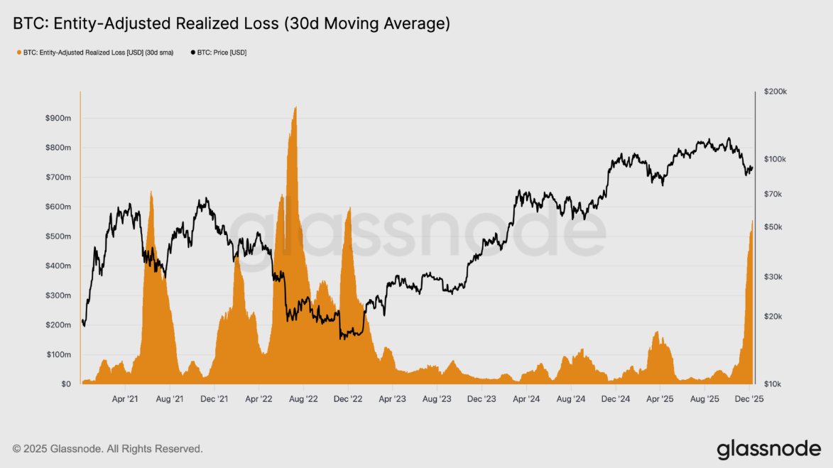 Rast realizovaných strát ukazuje, že viacerí investori pristupujú k predaju aj počas období oživenia. Napríklad aj pri návrate ceny smerom k 92 700 dolárom stúpol 30-dňový kĺzavý priemer realizovanej straty upravenej o entity až na 555 miliónov dolárov denne, čo je najvyššia hodnota od obdobia kolapsu burzy FTX. Ide o jasný signál frustrácie medzi kupujúcimi z vrcholu, ktorí sa rozhodujú pre odchod namiesto vytrvania.