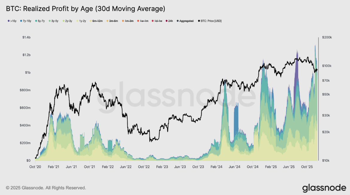 Súčasne sú viditeľné aj masívne realizované zisky skúsených dlhoročných investorov. Držitelia s horizontom viac ako jeden rok počas posledného odrazu zvyšovali svoje zisky až na rekordných 1,3 miliardy dolárov denne. Kombinácia týchto dvoch trendov, predaj pod tlakom a masívny výber ziskov, vytvára prirodzenú brzdu pre rýchlejší obrat smerom nahor.