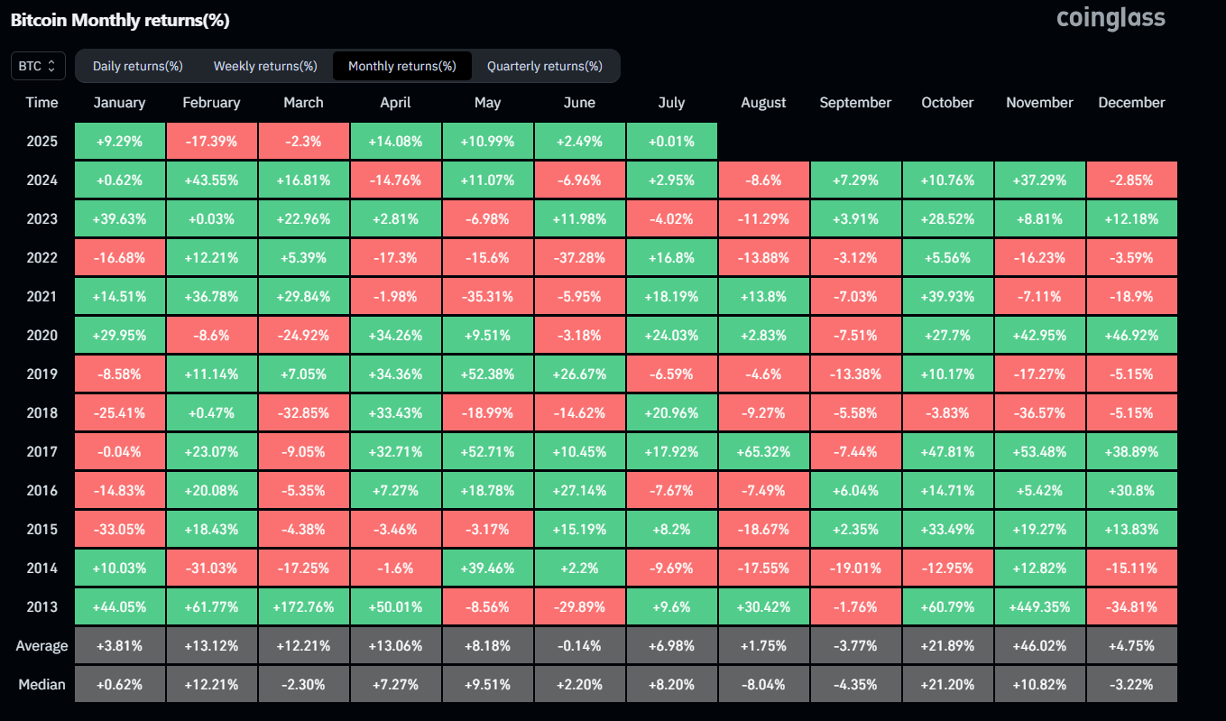 Bitcoin patrí medzi najvolatilnejšie aktíva na svete, no aj na tomto trhu sa objavujú sezónne vzorce. Jedným z nich je slabší letný výkon. Dáta z platformy Coinglass ukazujú, že jún, júl a august patria k najmenej výnosným mesiacom v kryptosvete. Priemerné výnosy v júni dosahujú len -0,14 %, v júli +6,98 % a v auguste +1,75 %. V porovnaní so zimnými alebo jarnými mesiacmi ide o slabý výkon.