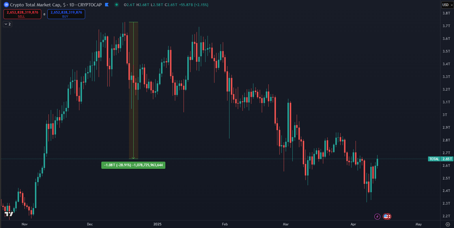 PR článok spoločnosti BITmarkets. Z trhu kryptomien zmizlo až 30 % celkovej kapitalizácie, čo podľa údajov TradingView predstavuje pokles o viac než 1,07 bilióna dolárov. Najväčší prepad nastal 7. apríla, keď trhová kapitalizácia dočasne klesla o až 38 %, teda o približne 1,42 bilióna dolárov.